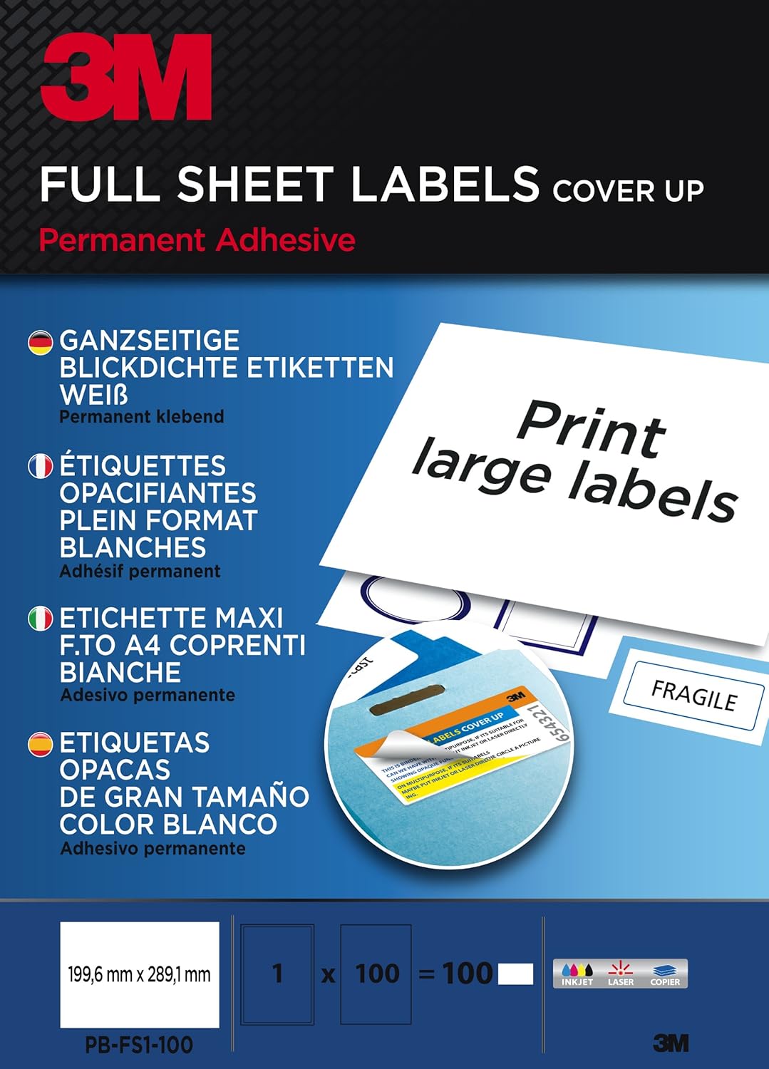 - Die 3M PBFS1100 Ganzseitigen blickdichten Etiketten bieten eine vollständig blickdichte Oberfläche, die perfekt zum wiederholten Beschriften von Ordnern, Dokumenten und verschiedenen Oberflächen geeignet ist, ohne dass alte Beschriftungen sichtbar bleiben.