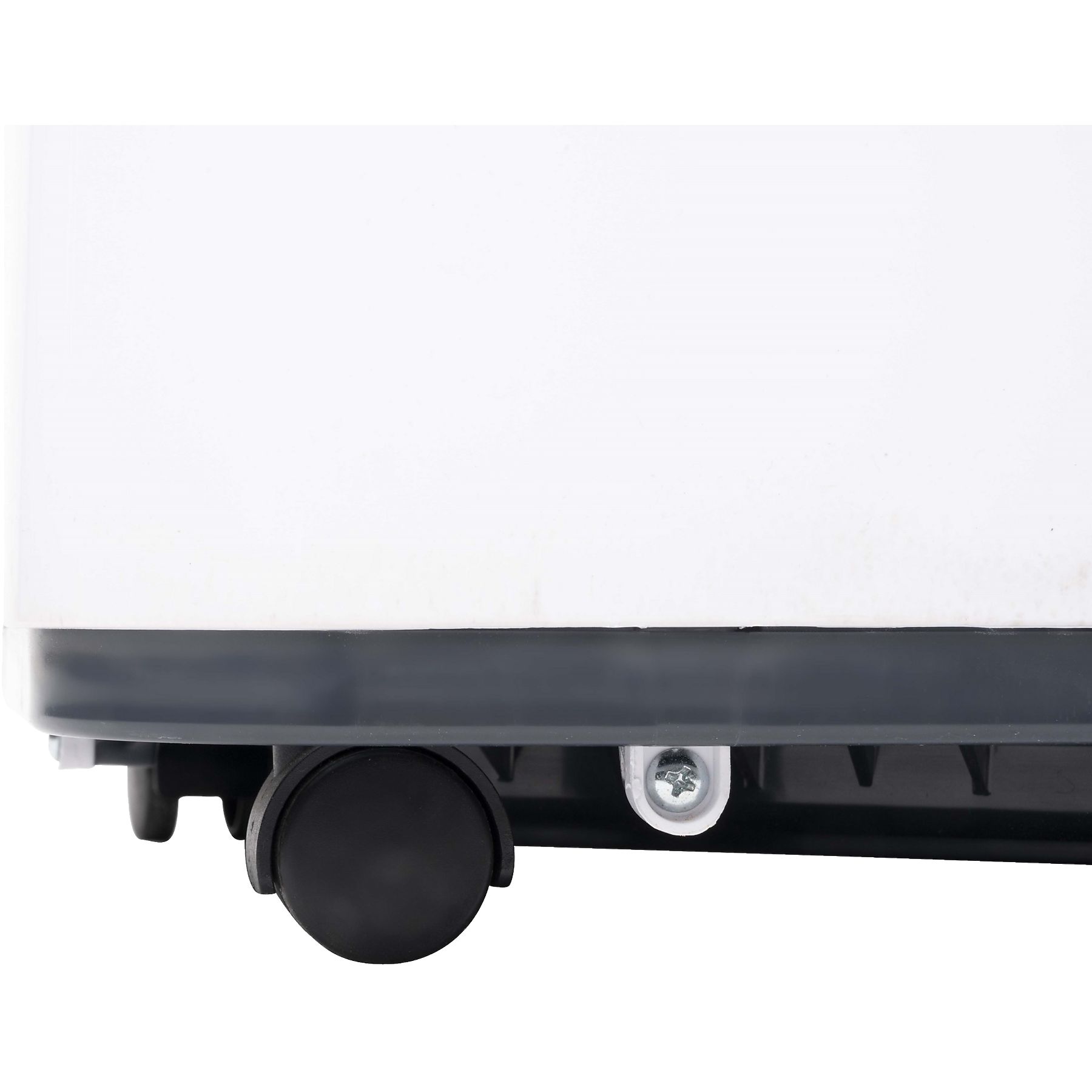 Die mobile Klimaanlage ist mit Rollen ausgestattet und lässt sich leicht von Raum zu Raum bewegen. Für den Betrieb als Klimagerät wird ein Abflussschlauch an einem Fenster installiert, um die warme Luft und Kondenswasser nach außen abzuleiten.