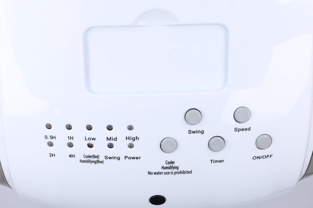 Ein integrierter 120°-Schwenkmechanismus verteilt die Luft horizontal, während die vertikale Richtung manuell eingestellt werden kann. Drei Gebläsestufen (niedrig, mittel, hoch) ermöglichen eine individuelle Anpassung der Luftzirkulation.