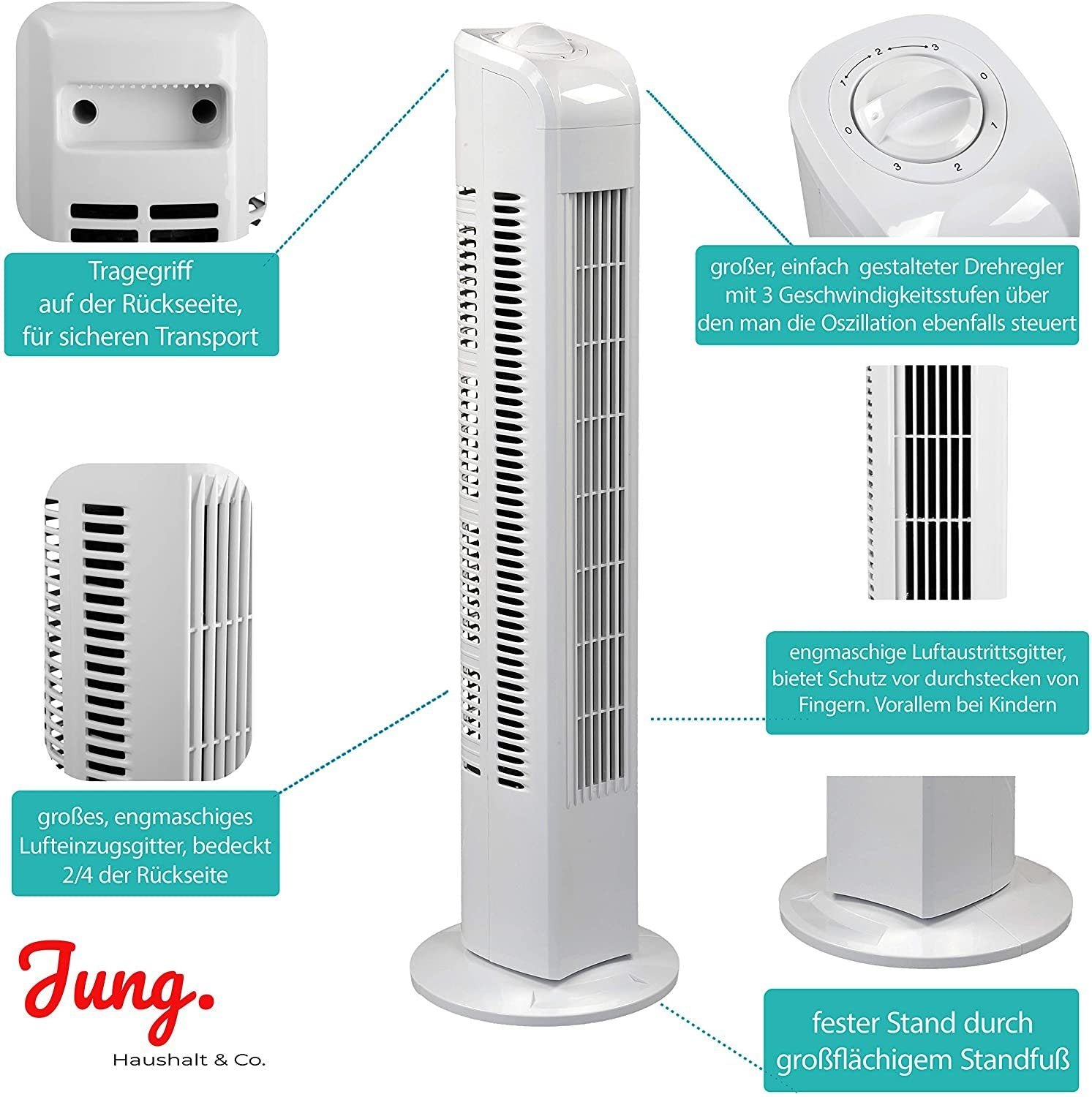 Der Commodoor Turmventilator mit 50 Watt Leistung ist ein modernes, energiesparendes Gerät, das besonders durch seine Effizienz und seinen niedrigen Geräuschpegel besticht. Mit seiner schlanken Turmform und einer Höhe von 76 cm ist der Ventilator nicht nur funktional, sondern auch ein optisches Highlight, das sich nahtlos in jede Wohn- oder Arbeitsumgebung integriert. Die 75° horizontale Oszillation verteilt die Luft gleichmäßig im Raum und sorgt für angenehme Frische bis zu einer Raumgröße von 50 Quadratmetern. Dabei verbraucht er extrem wenig Strom und schont so Umwelt und Geldbeutel.
