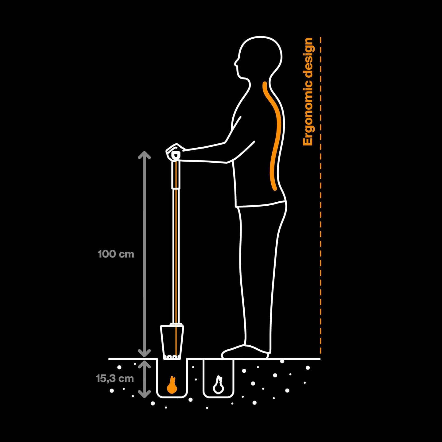 Der Fiskars Ergo Blumenzwiebel-Pflanzer ermöglicht das Setzen von Zwiebeln und kleinen Setzlingen, ohne dass der Benutzer sich bücken oder auf die Knie gehen muss. Dank der Länge von 1 Meter ist komfortables Arbeiten im Stehen möglich, was Rücken und Knie deutlich schont.Tiefe Pflanzlöcher bis zu 15 cm für Zwiebeln und Setzlinge