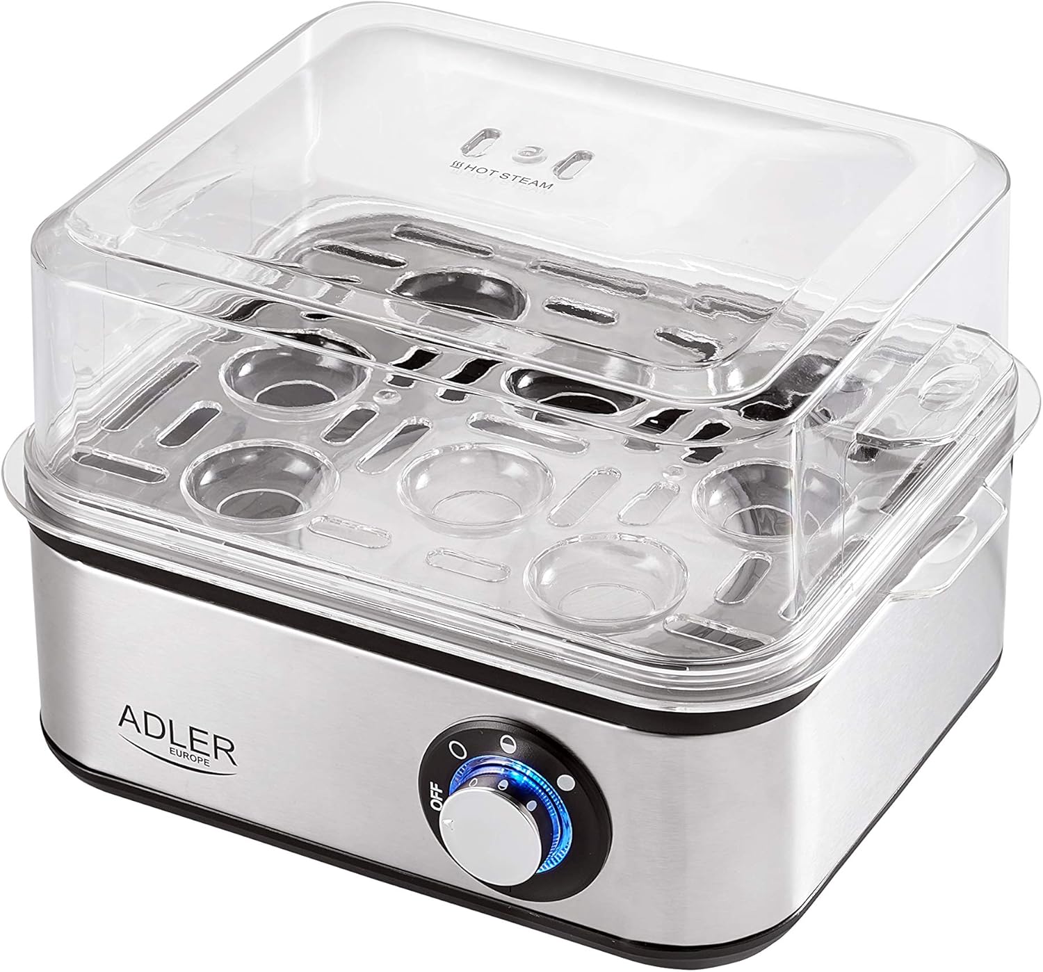 JUNG ADLER AD4486 Eierkocher Edelstahl 800W 8 Eier Härtegrad einstellbar BPA-frei Eierkocher Messbecher Eierstecher Spiegelei-Pfännchen kompakt klappbare Haube Eierkocher Edelstahlgehäuse