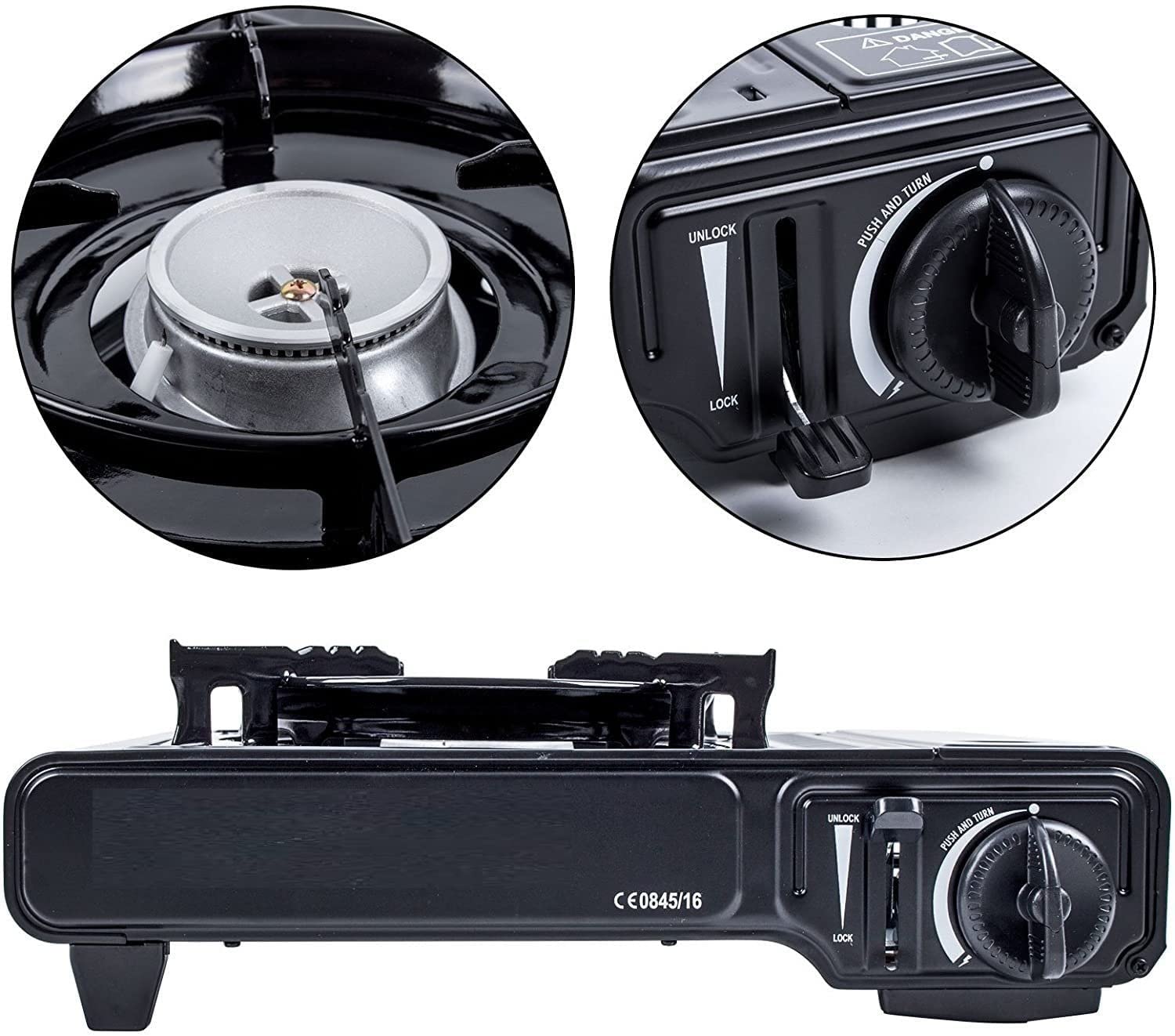 Der Gaskocher bietet ein hohes Maß an Sicherheit durch eine integrierte Kartuschensicherung, die bei Bedarf die Gaszufuhr unterbrechen kann. Zudem lässt sich die Flamme stufenlos regulieren, was eine sichere und kontrollierte Nutzung ermöglicht.Tragbarer Kocher mit robustem Kunststoffkoffer: