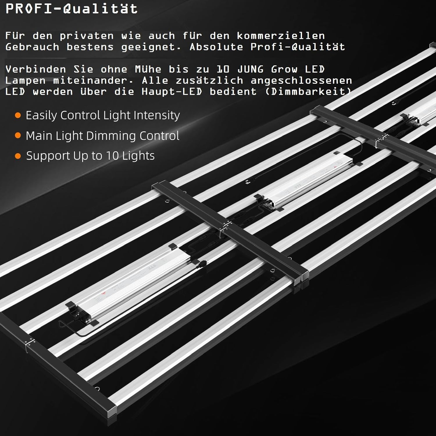 Die JUNG LED-Wachstumslampe verwendet fortschrittliche Samsung LEDs und liefert ein kraftvolles Vollspektrum (3000 K + 6000 K + 660nm + IR + UV) für optimale Bedingungen in allen Wachstumsphasen der Pflanzen. Mit einer Leistung von 360W und einer Effizienz von 2,6 umol/J garantiert sie eine verbesserte Ausbeute von bis zu 50 %.Stufenlos dimmbar (0-100%)