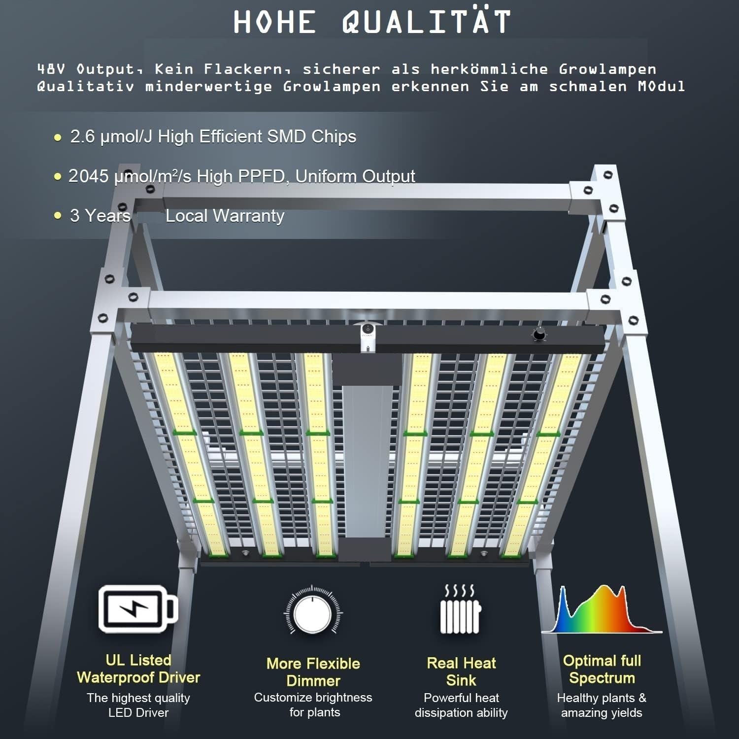 Mit einer Energieeffizienz von 2,6 umol/J verbraucht die Lampe nur 360W, was sie weitaus energieeffizienter macht als herkömmliche 1000W LED Growlampen. Zudem arbeitet sie ohne Lüftergeräusche, was zu einer sehr ruhigen Nutzung beiträgt.