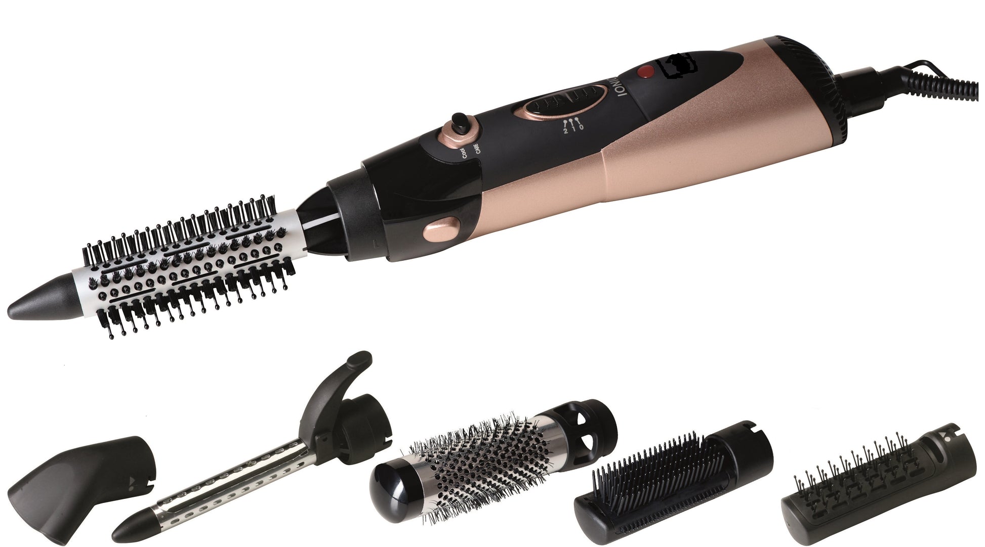 MIA MultiGlam Warmluftbürste 1000W, Föhnbürste, Lockenstab, Ionen-Technologie, Multifunktionales Hairstyling, 6 Aufsätze, Ergonomisches Design, Kühlfunktion, Trocknen und Styling in einem Gerät