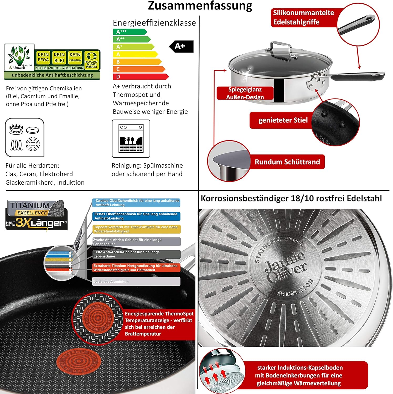 ▪ Titanium Excellence Antihaftbeschichtung: Mit der innovativen 6-Lagen-Titanium Excellence Antihaftversiegelung genießen Sie perfekte Bratergebnisse, da diese Beschichtung bis zu drei mal länger hält als herkömmliche Antihaftbeschichtungen und besonders resistent gegen Kratzer und Abnutzung ist.