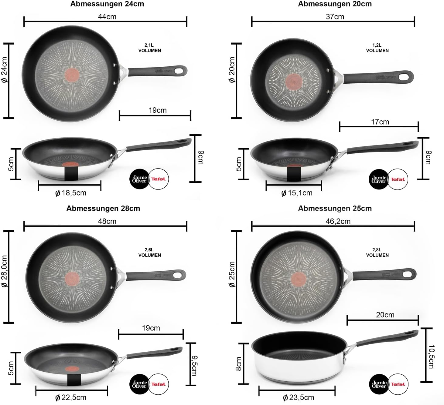 Das Tefal Jamie Oliver Pfannenset vereint hochwertige Materialien, innovative Technologien und das Design von Jamie Oliver. Es umfasst Pfannen in den Größen 20 cm, 24 cm und 28 cm, sowie eine Schmorpfanne mit Deckel (25 cm). Diese Pfannen wurden entwickelt, um nicht nur exzellente Bratergebnisse zu liefern, sondern auch Ihr Kocherlebnis zu verbessern.