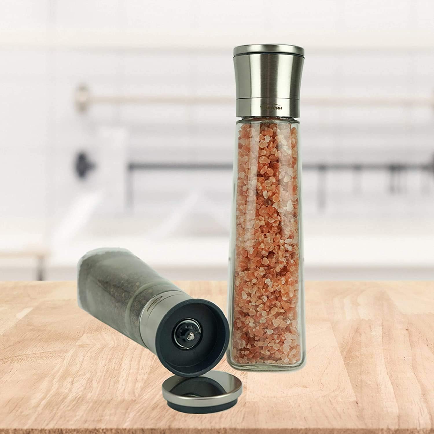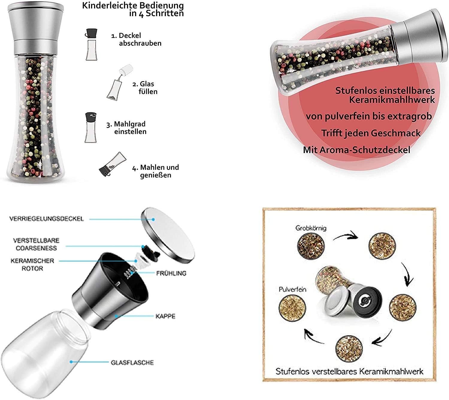 Die Verschlusskappen sind ein weiteres durchdachtes Detail, das für eine krümelfreie Handhabung sorgt und die Frische der Gewürze bewahrt. Das Edelstahlummantelte Mahlwerk steht für Stabilität und Hygiene. Insgesamt präsentiert sich das Set als hochwertige und langlebige Lösung, die das Würzen von Speisen zum Genuss macht. Ideal für den Einsatz mit Salz, Pfeffer und vielen weiteren Gewürzen.